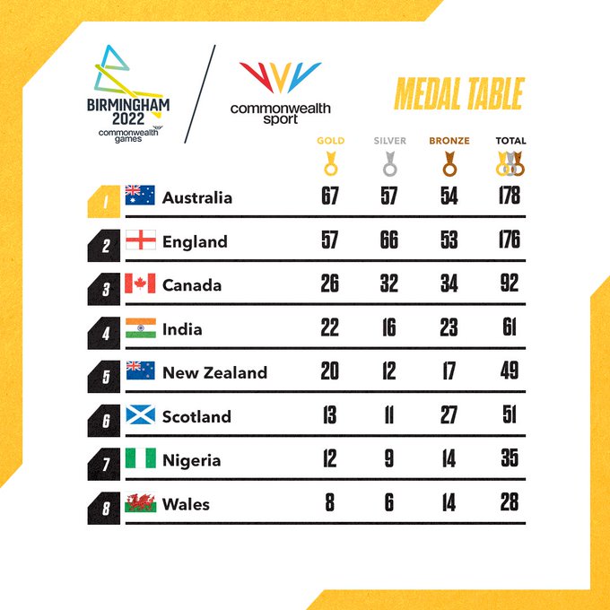 India’s performance was so good they won 22 gold medals even without shooting and archery as they are not part of the 2022 Commonwealth Games. India bagged a total of 61 medals and finished fourth in ranking overall.