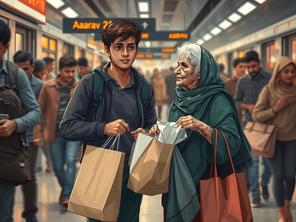 As he stepped onto the train, he barely noticed the elderly woman struggling with her heavy shopping bags. She was leaning against the metal pole, adjusting her grip, but the weight was too much. Aarav hesitated, his mind debating whether to help or keep scrolling through his emails like everyone else.